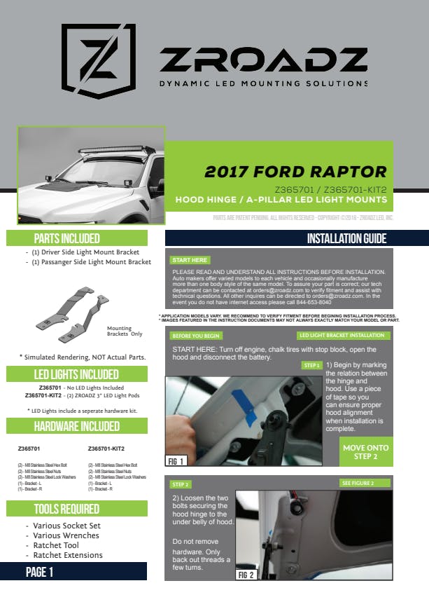ZROADZ Hood Hinge LED Mounts, commonly known as ditch light brackets, and kits are one of the easiest upgrades to add auxiliary lighting to a vehicle. The small low profile package adds functional utility and the mounting brackets are a simple, no drill, bolt on installation utilizing the factory hood attachment points to mount to the vehicle. Simply loosen the factory hood bolts, slide the ZROADZ bracket into place and re-tighten the bolts. These versatile kits are ideal for lighting the trail, or a work area. ZROADZ Hood Hinge bracket mounts are designed and manufactured in USA.