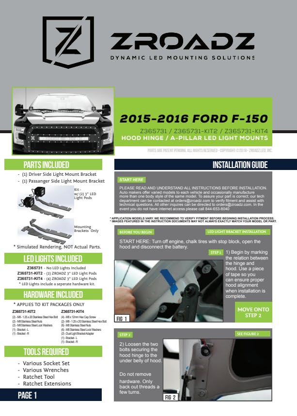 ZROADZ Hood Hinge LED Mounts, commonly known as ditch light brackets, and kits are one of the easiest upgrades to add auxiliary lighting to a vehicle. The small low profile package adds functional utility and the mounting brackets are a simple, no drill, bolt on installation utilizing the factory hood attachment points to mount to the vehicle. Simply loosen the factory hood bolts, slide the ZROADZ bracket into place and re-tighten the bolts. These versatile kits are ideal for lighting the trail, or a work area. ZROADZ Hood Hinge bracket mounts are designed and manufactured in USA.