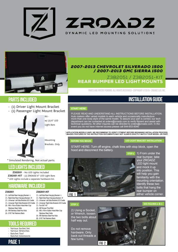 ZROADZ Rear Bumper LED Mounts and kits are a great way to add a pair of rear facing, LED lights to the back of most popular late models foreign and domestic trucks. The Bracket mounts position lighting down low at the rear of the vehicle ideal for super high powered, manually activated back up lights or scene lighting to illuminate a large area. The simple bolt on installation, uses factory bolt mounting locations and requires no drilling. Simply loosen the pre-determined bolts, slide the ZROADZ bracket into place and retighten the bolts. ZROADZ Rear Bumper LED Mounts are available in complete kits with light and wiring harness, or as brackets only for mounting common and popular LED lights. ZROADZ Rear Bumper LED Mounts are designed and made in USA.