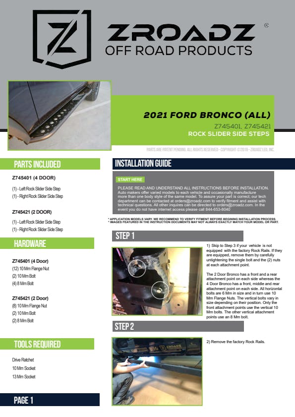 ZROADZ Rock Slider Side Steps are built to perform under the most rigorous conditions while still providing a large step area with perforated top plates for aid during entry. Designed with high clearance in mind to protect your vehicle's rocker panels, ZROADZ Rock Slider Side Steps feature a rear kick out that helps you slide across larger obstacles and doubles as an oversized step to help you reach your gear mounted to your roof. ZROADZ Rock Slider Side Steps are made from heavy gauge 2.0-inch mild steel tubing and come standard with a 3 stage epoxy based black powder coated finish. Installation is completed in less than 30 minutes. ZROADZ Rock Slider Side Steps are covered with a limited 3-year warranty against material and workmanship and a 1-year warranty on the finish.